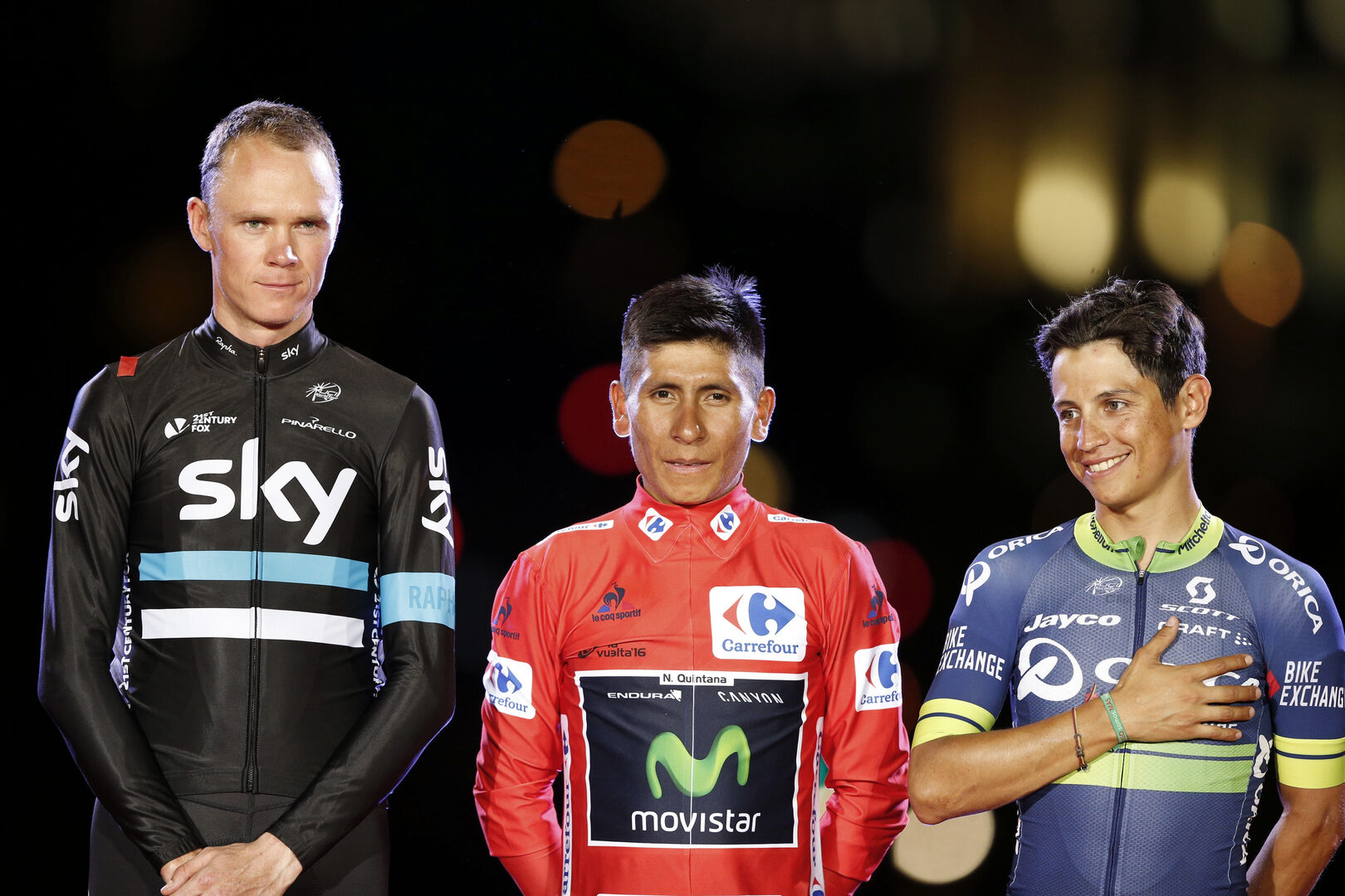 Quintana subió al podio escoltado por su rival y enemigo íntimo británico Chris Froome (Sky), tres veces su muro insalvable en el Tour, su bestia negra, a la que por fin pudo destripar su parte más humana. Froomey colecciona tres segundos puestos en la Vuelta. Algo así como el Nairo del Tour. La tercera plaza para la sonrisa de Colombia, Esteban Chaves (Orica), en un año grande, ya que fue segundo en el Giro de Italia.