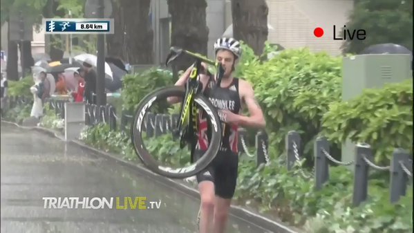 Una aparatosa caída a falta de un kilómetro para el final del sector ciclista obligó al menor de los hermanos Brownlee a cargar la bicicleta al hombro bajo la lluvia por el circuito de Yokohama.