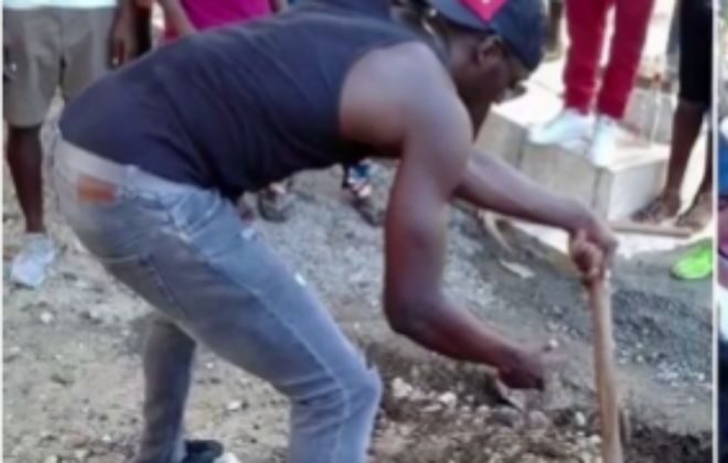 Con camiseta negra de hombreras y pantalón vaquero, Bolt aparece en las imágenes cavando la tumba en la parroquia jamaicana de Portland y a continuación en fotos junto al desaparecido atleta.