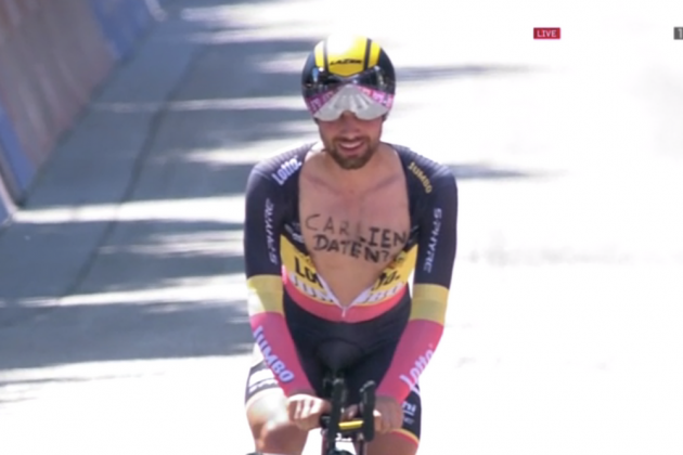 El belga Victor Campenaerts (Lotto Jumbo) no tuvo mejor idea para pedir cita a una chica llamada Carlien que pintarse en el pecho una frase que lució al comienzo y fin de la cronometrada abriéndose el maillot de par en par.