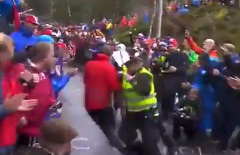 La secuencia ocurrió durante el Mundial de ciclismo en Bergen. Un aficionado pretendía animar de cerca a Tony Martin y, mientras corría, un policía le detuvo de una manera poco ortodoxa.