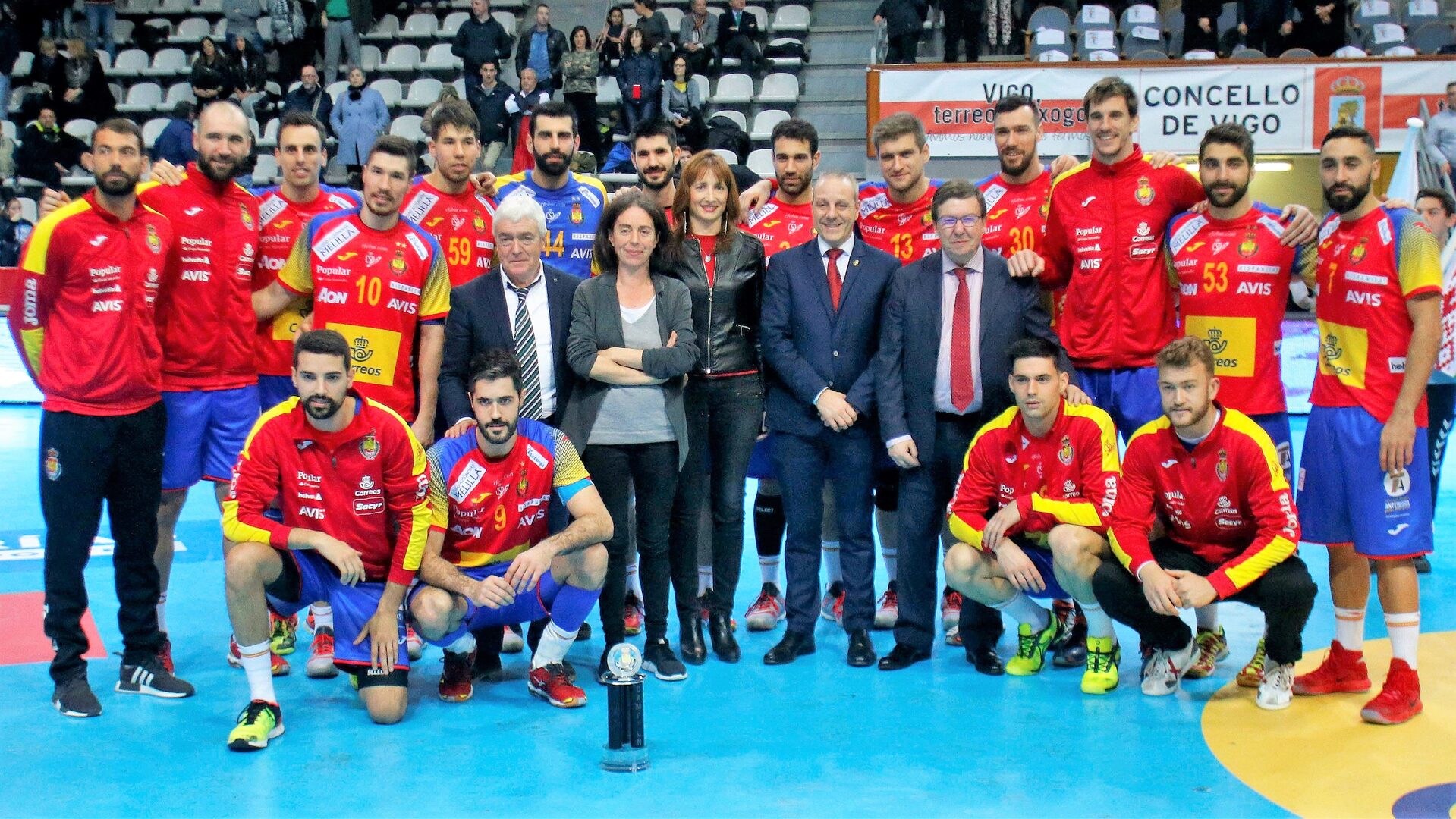 Los jugadores de la selección española posan con el trofeo del Memorial Domingo Bárcenas conquistado el pasado domingo en Vigo. | EFE
