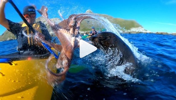Esta siendo la imagen de la semana. Kyle Mulinder recibió un ‘pulpazo’ en toda la cara mientras pasaba la mañana con su piragua y unos amigos. Todo ocurrió en la costa de Kaikura, una localidad de la isla Sur de Nueva Zelanda.