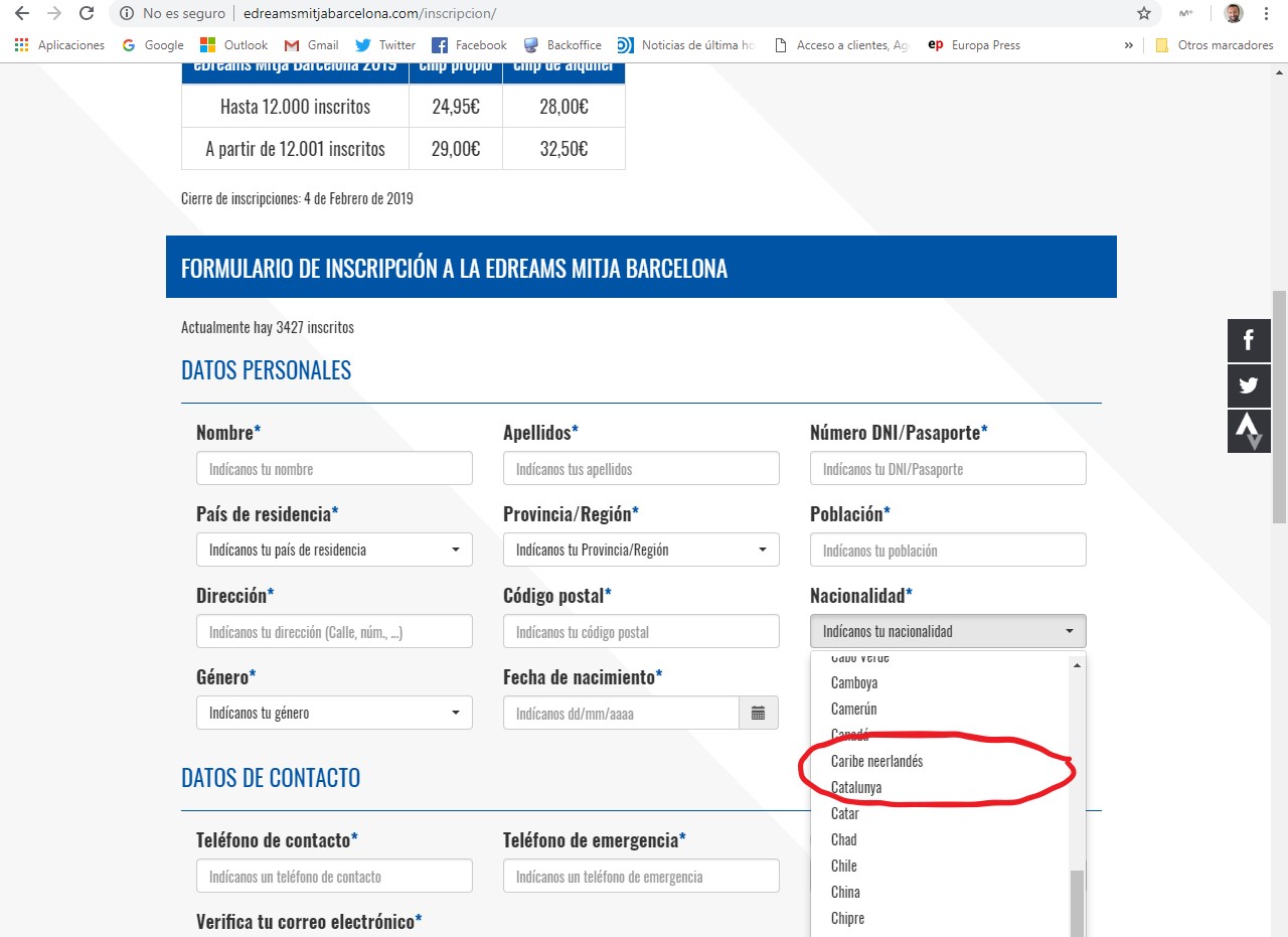 Es decir: en el desplegable de nacionalidad, dentro del apartado de 'Inscripciones' (http://www.zurichmaratobarcelona.es/esp/inscripciones.html), también aparece la opción 'Catalunya', justo por debajo de 'Caribe neerlandés' y de 'Catar'.