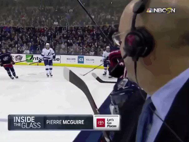 Pierre McGuire, comentarista de la NBC, estuvo cerca de recibir en impacto de un disco de hockey que salió descontrolado en dirección a los banquillos. Se libró por los pelos.