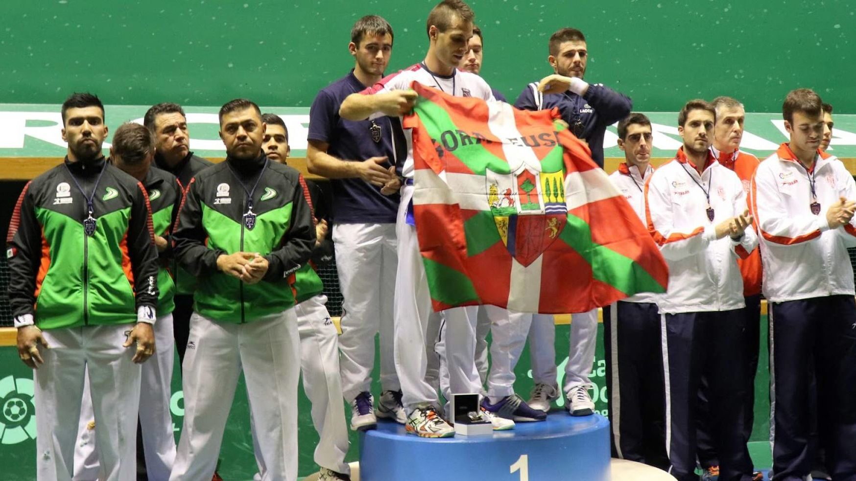 Polémica en la pelota vasca. La Federación Internacional (FIPV) ha impuesto un año de sanción al pelotari Bixintxo Bilbao por haber mostrado una ikurriña en el podio del Campeonato del Mundo de Pelota, celebrado el pasado mes de octubre en Barcelona, cometiendo así así una "sanción grave" por tratarse de "una bandera no autorizada".