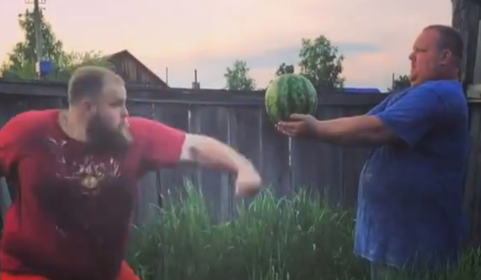 Vasily Kamotsky el campeón del Mundo de dar bofetadas, se entrena partiendo sandías