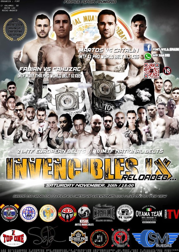 Entre los tres cinturones mundiales que se van a poner en juego destacan las peleas que van a protagonizar dos luchadores españoles, Jonathan Fabián y Juan Martos, que son dos de los grandes triunfadores de la pasada edición de Invencibles. Fabián, campeón del mundo de Muay Thai y conocido como Scarface, y la Avispa Martos, campeón mundial de K1, tendrán que defender sus títulos mundiales en Galapagar frente al francés Loic Cahuzac y el rumano Eduardo Catalin, respectivamente.