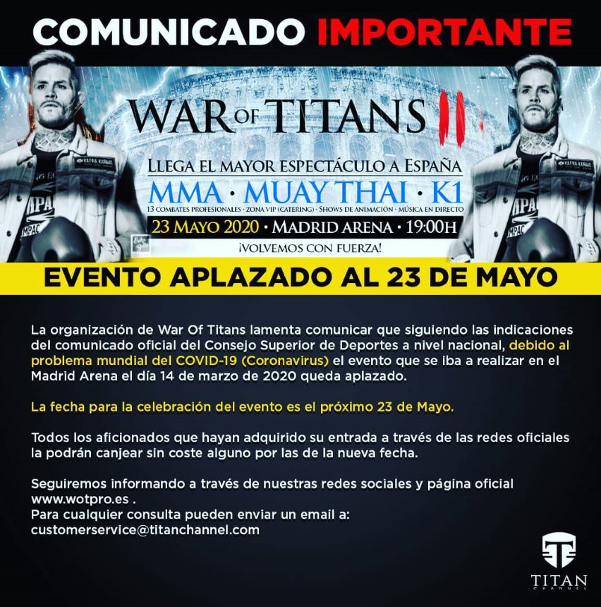 El coronavirus sigue causando muchos estragos al deporte y uno de los eventos afectados es el War of Titans II, la mayor velada de los deportes de contacto en España que en principio estaba programada para el próximo sábado 14 de marzo en el Madrid Arena.