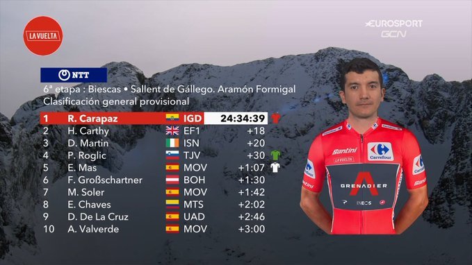 Richard Carapaz, el mejor entre los favoritos, vio la debilidad de Primoz Roglic en el ascenso y dejó plantado al esloveno en los últimos kilómetros, perdiendo 43 segundos respecto al ecuatoriano, quien se colocó líder de la general. Segundo ahora es el británico Hugh Carthy, a 18 segundos, tercero el irlandés Dan Martin (UAE) a 20 y baja hasta la cuarta posición Roglic a 30. En la quinta posición está el primer español, Enric Mas a un minuto y siete segundos del líder en la general.