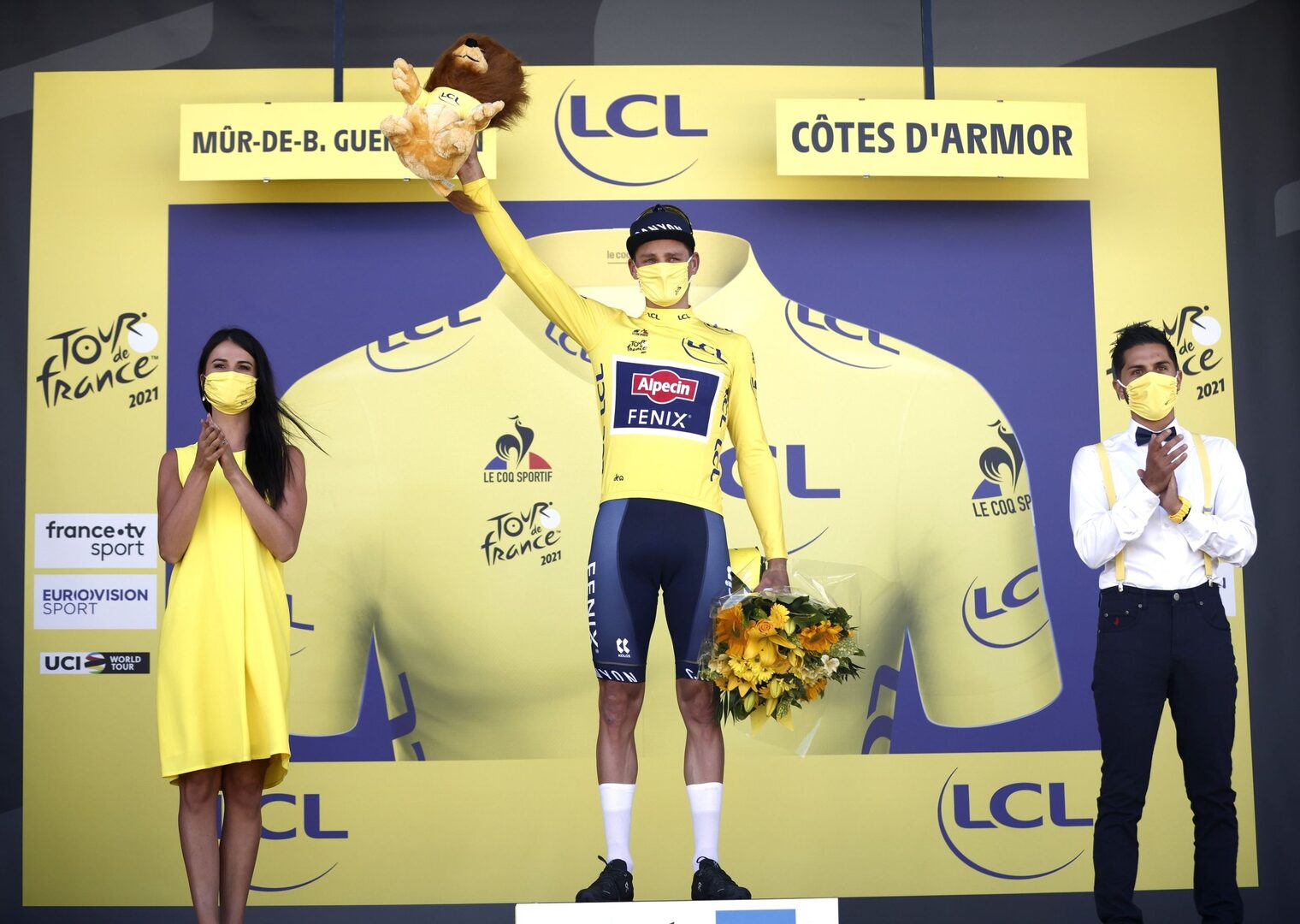 El líder del Alpecin cruzó la meta en solitario como vencedor de la segunda etapa disputada entre Perros-Guirec y el Muro de Bretaña Guerlédan, de 183.5 kilómetros, en la que superó por 6 segundos al dúo esloveno Pogacar-Roglic, en 8 a un grupo con Alaphilippe, Enric Mas, Quintana y Valverde y en 23 a candidatos como Geraint Thomas y Miguel Ángel López. Una estocada de fe, fuerza y ambición.