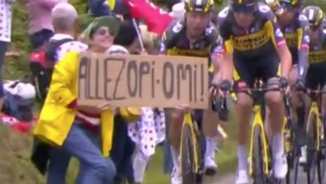 La mujer agitaba una pancarta dando la espalda a la dirección que tomaba la carrera, siendo atropellada por el pelotón y provocando la caída de muchos ciclistas a 45 km de la llegada el pasado sábado. La mujer portaba una pancarta en la que se leía "Allez Opi-Omi!", "¡Vamos abuelo y abuela!", en castellano.