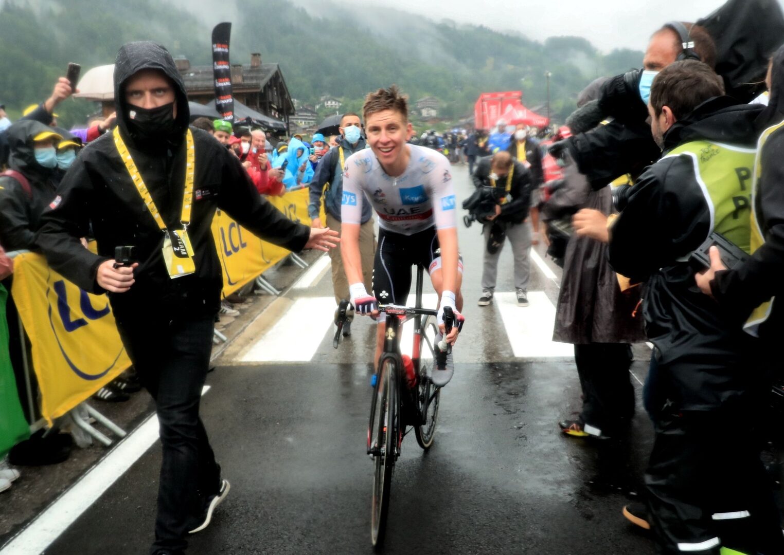 Pogacar fue aventajando a todos los supervivientes de la escapada, hasta que en la cima de la Colombiere, última dificultad montañosa a 14 kilómetros de la meta, solo Teuns quedaba por delante. Aventajó en 3:20 al grupo de Carapaz, en el que también estaban el español Enric Mas, el colombiano Rigoberto Urán y el danés Jonas Vingegaard, y a 5:09 al belga Wout van Aert, que conserva el segundo puesto de la general con una desventaja de 1.48 con respecto al esloveno. Tercero es el kazako Alexei Lutsenko a 4:38, por delante de Urán a 4.46, Vingegaard a 5:00 y de Carapaz a 5:01, mientras que Mas es ahora octavo a 5:15.