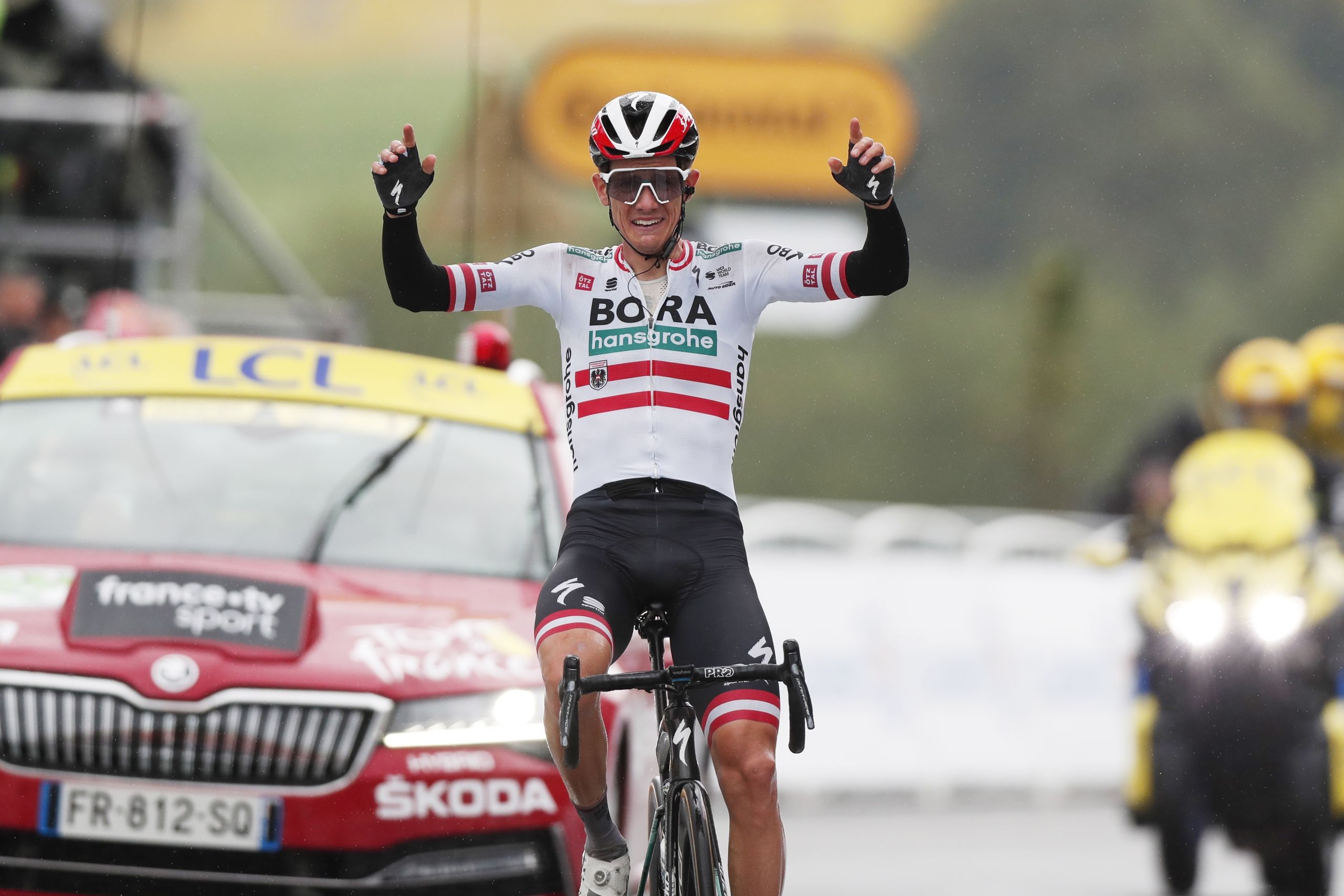 El campeón de Austria, del equipo Bora, formó parte de la fuga del día, hasta que logró deshacerse de sus dos compañeros de escapada y efectuó un último tramo en solitario huyendo de la persecución del francés David Gaudu y el italiano Simone Colbrelli. Sin suerte la etapa del pasado sábado en Quillan, donde se vio sorprendido por el holandés Bauke Mollema, Konrad ha logrado esta vez, al fin, su primer triunfo en una vuelta de tres semanas.