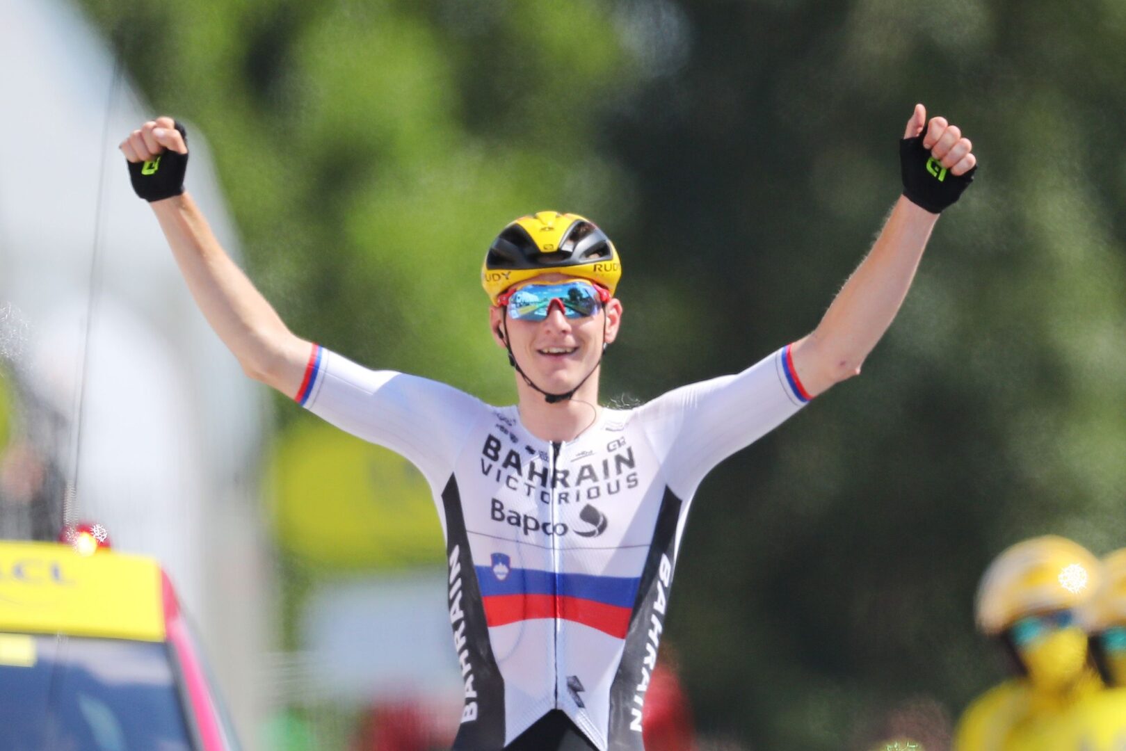 El esloveno cruzó la meta señalando el maillot de su equipo, el Bahrein, y haciendo el gesto de cerrar bocas, un día después de que la gendarmería francesa registrara su hotel por una investigación abierta por tenencia de productos dopantes.