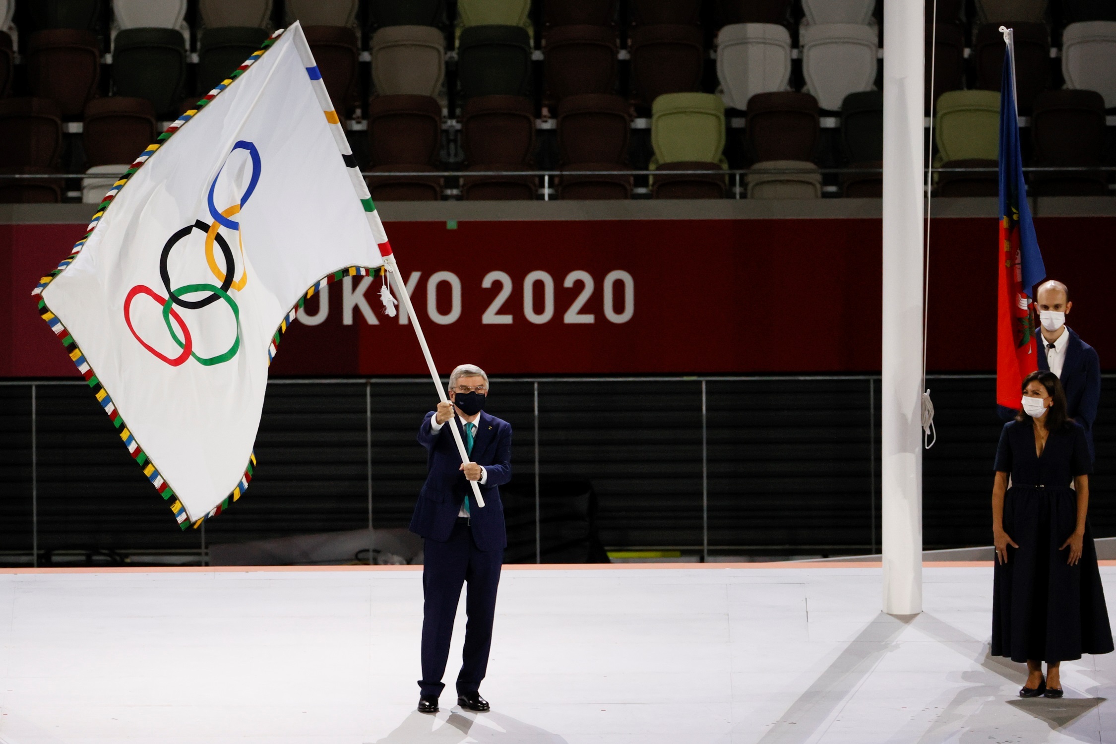 El presidente del Comité Olímpico Internacional (COI), Thomas Bach , entrega la bandera olímpica a la alcaldesa de París, Anne Hidalgo, que albergará los Juegos de 2024, durante la ceremonia de clausura de los Juegos Olímpicos 2020.