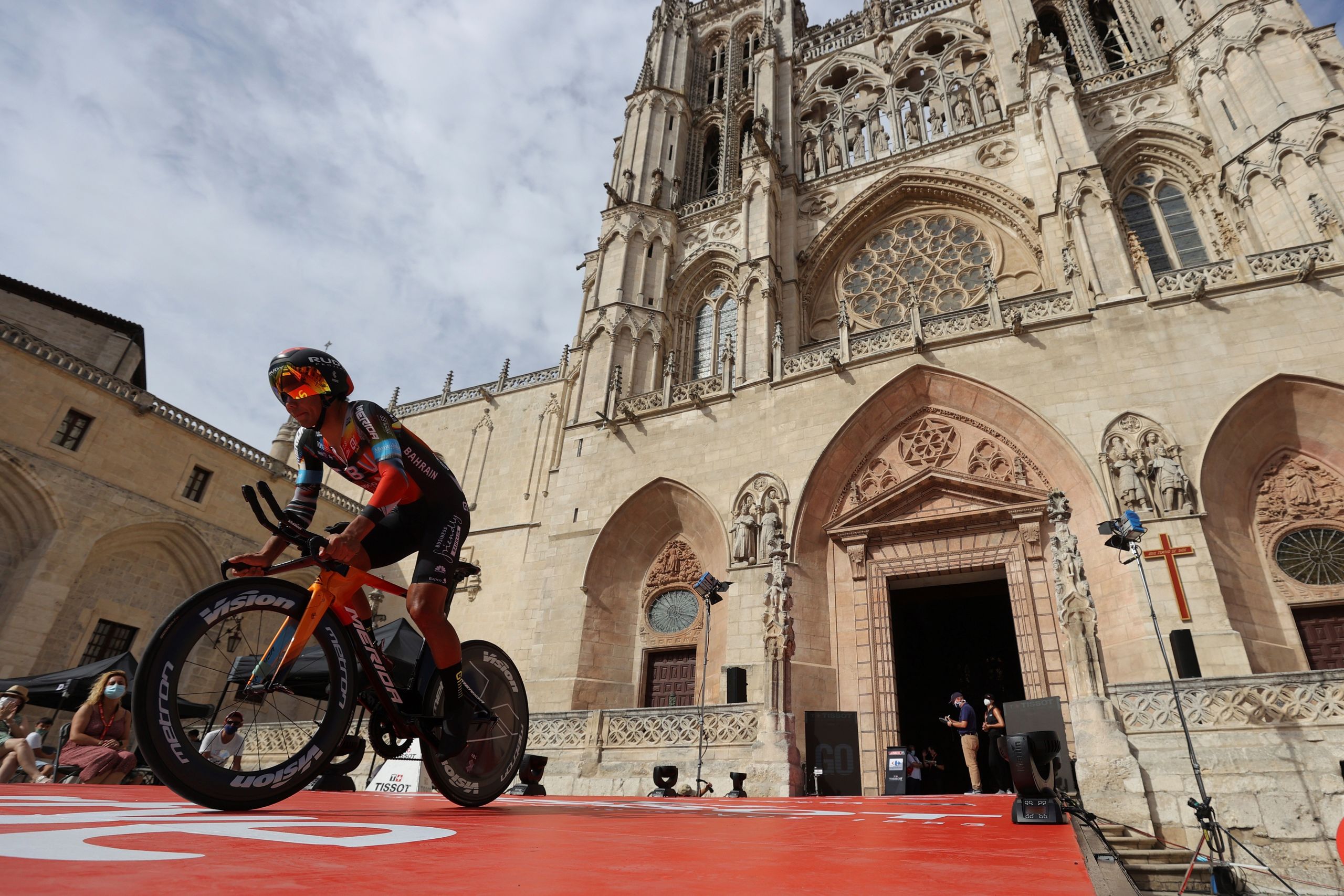 El listón estaba alto, los aspirantes a desbancar a Aranburu debían volar en el ascenso al castillo y arriesgar por el casco urbano y monumental de Burgos, muy animado a pesar del calor y por la presencia de curiosos turistas que no se esperaban la fiesta del ciclismo en torno a la catedral Patrimonio de la Humanidad. Los grandes nombres iban saliendo por la rampa roja del templo gótico. Algunos nombres inesperados se colaban entre los mejores, como el neozelandés Scully, el checo Cerny e incluso el esloveno Tratnik, pero Aranburu seguía sin quitar ojo al televisor. Enric Mas dio el susto. Su bicicleta serpenteó por momentos, pero aguantó el tipo el sexto clasificado en el Tour. Carapaz y Bernal enseguida mostraron debilidad. No iban a superar a Aranburu. Solo quedaba por llegar el patrón de las dos últimas temporadas: Primoz Roglic. Y llegó volando Roglic, bien acoplado en su máquina de crono, motivado tras el oro olímpico. Levantó de la silla a Aranburu y luego los brazos en un podio con la entrada de la catedral a sus espaldas. En el anochecer de Burgos celebró su sexta victoria en la Vuelta, tal vez la que le impulse al tercer triunfo absoluto consecutivo. El ciclista de Zagorje, retirado en el Tour y aliviado en sus penas con el oro en Tokio, ya sueña con el triplete en Santiago de Compostela, donde le espera otra crono, pero más larga, de 33 km. Roglic lanzó el primer aviso. Viene a ganar, sin contemplaciones. Monumental estreno en un escenario de ensueño..