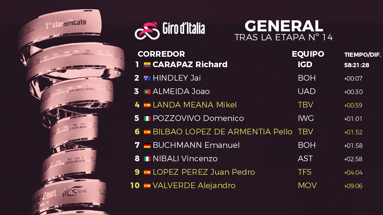 Hay cambio de líder en el Giro de Italia. El español Juanpe López ha resistido hasta este sábado, durante diez etapas. La maglia rosa pasa a ser ahora de Richard Carapaz que terminó tercero en la meta de Turín, donde se impuso el británico Simon Yates que sumó su vigésimo octavo triunfo de su carrera en un Giro que ya no puede ganar. Juanpe acabó décimo, a más de cuatro minutos pero hubo ciclistas importantes, que pelean por la general, que también perdieron tiempo. Más de 50 segundos Mikel Landa, cuarto en la general (a 59 segundos), y Pello Bilbao.