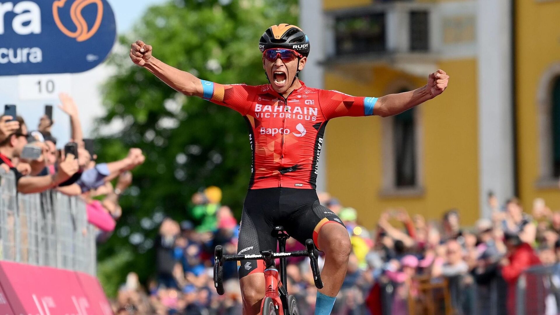 Gran día para el Bahrain. Triunfo enorme de Buitrago, un chico de 22 años de Bogotá, quien maldecía su suerte hace unos días porque Ciccone le privó del triunfo en Cogne. Ahora le tocó saborear la gloria, y de qué manera. Entró en solitario, a lo grande, en la meta de Lavarone, con un tiempo de 4h.27.11.