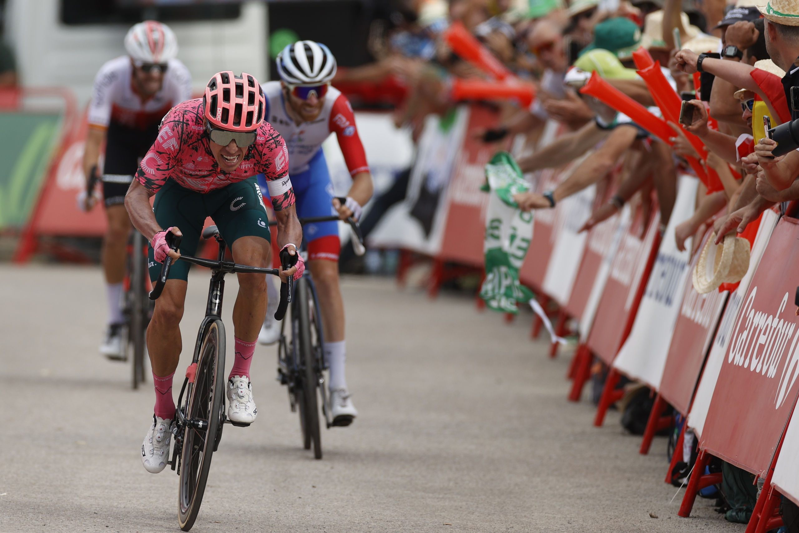 Fue ahí donde comenzó una dura lucha entre Marc Soler, Rigoberto Urán, Jesús Herrada y Quentin Pacher (Groupama-FDJ), que no terminaban de ver el momento idóneo para atacar. Finalmente el que se atrevió fue Herrada, quien llegó a verse ganador, líder a apenas 200 metros de la meta. Sin embargo, Rigoberto Urán respondió y se puso por delante en los últimos metros, arrebatándole la victoria a los dos españoles, en lo que podría haber sido la tercera etapa para el ciclismo nacional en esta edición de La Vuelta.