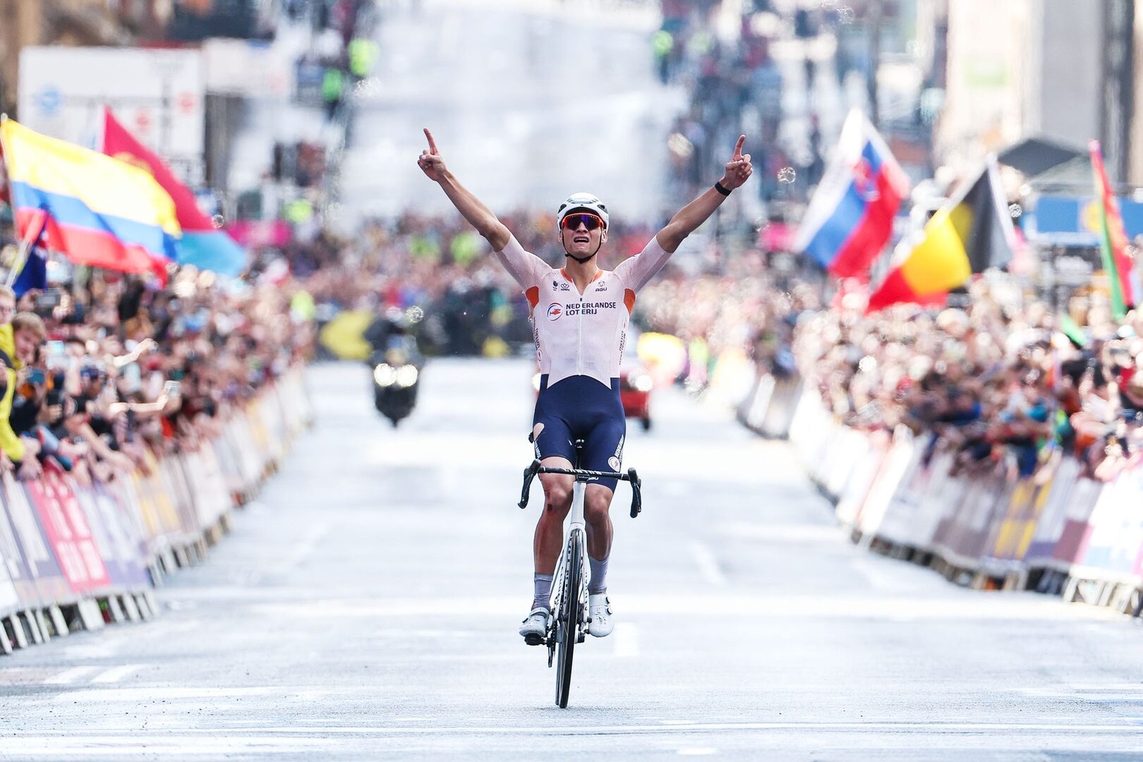 El ciclista neerlandés Mathieu van der Poel se ha proclamado este domingo campeón del mundo de ciclismo en ruta en los Mundiales que se están disputando en Glasgow, después de marcharse en solitario a 22 kilómetros del final del técnico recorrido urbano de 271,1 kilómetros por la ciudad escocesa y de reponerse a una caída en el tramo final.