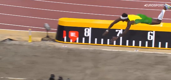 Este era su tercer salto, que por supuesto no fue dado como válido. El jamaicano tenía que forzar para poder optar a un premio mayor y no le salió bien. Nada bien. Además acabó con molestias en el tobillo.