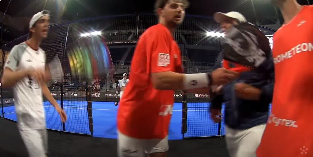 El partido continuó. Yanguas y Garrido se llevaron el segundo set por 6 a 7 y la bronca definitiva ocurrió en el break del 3 a 3. Lebrón y Galán pierden su saque y ahí llega el enganchón. Lebrón pega un pelotazo contra la pared para achantar a Yanguas y Juani Mieres, entrenador de Yanguas y Garrido, se levanta y se encara con el gaditano para recriminárselo.