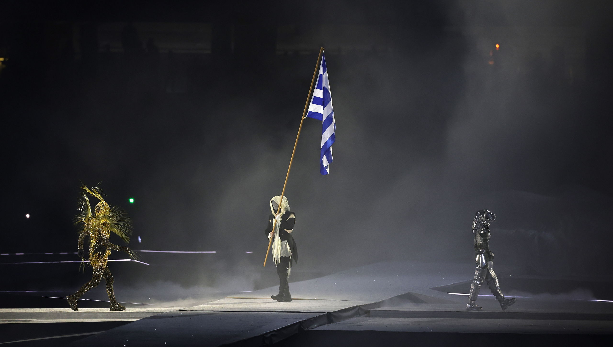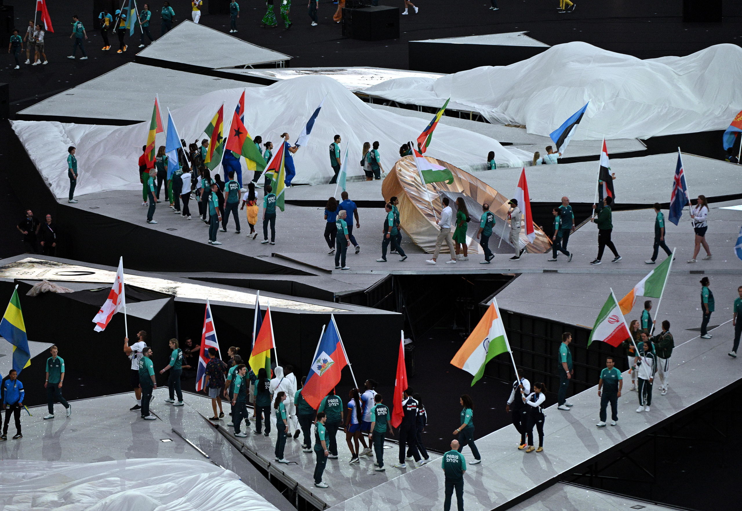 Tras el himno francés, han empezado a entrar los abanderados de cada delegación y han recorrido la superficie del escenario hasta rodearlo por completo, capitaneado por los abanderados franceses y cerrándolos, los estadounidenses, ya que las próximas olimpiadas serán en en Los Ángeles en 2028.