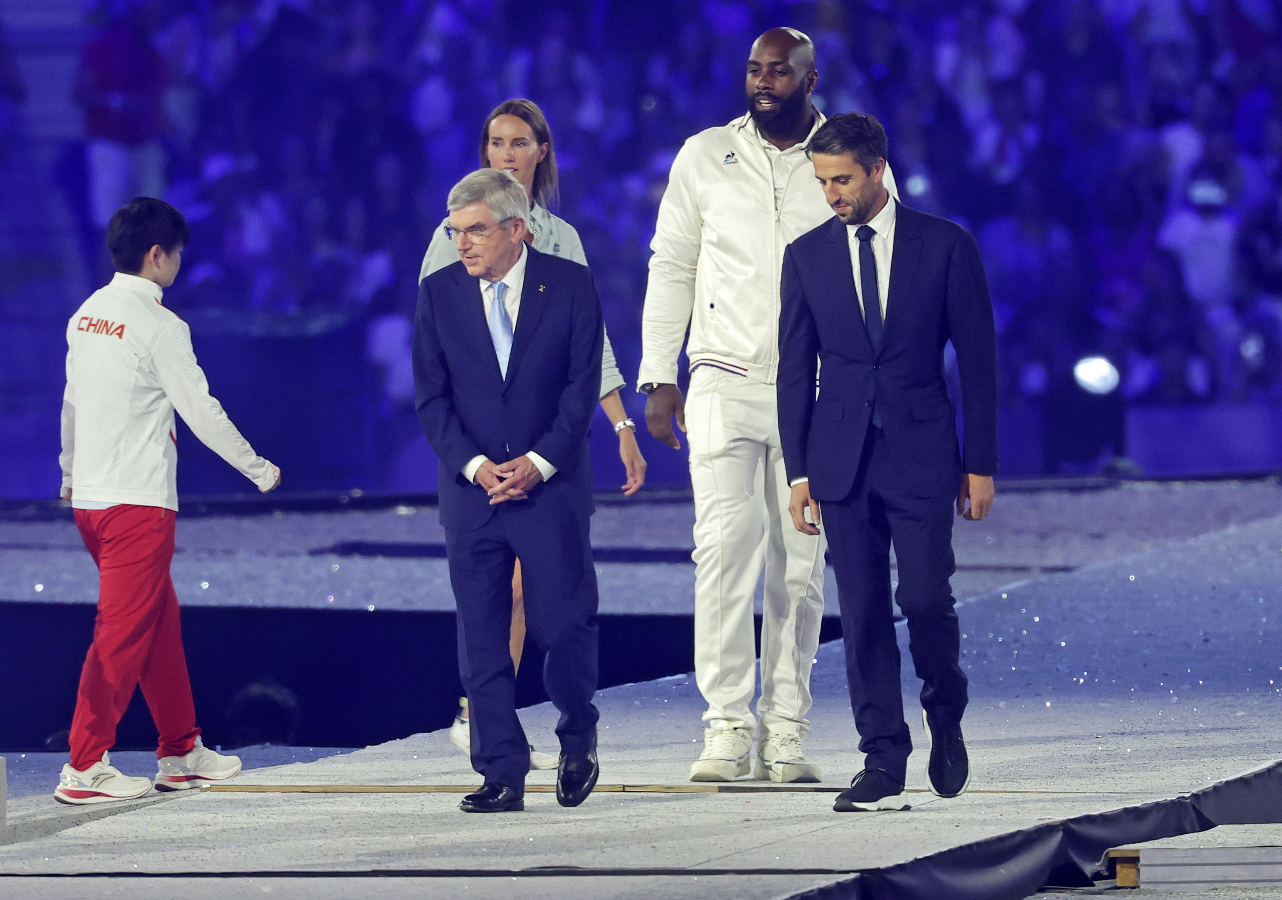 El presidente del Comité Olímpico Internacional Thomas Bach y el presidente de París2024, Tony Estanguet, dirigiéndose a dar el último discurso de la ceremonia de clausura.