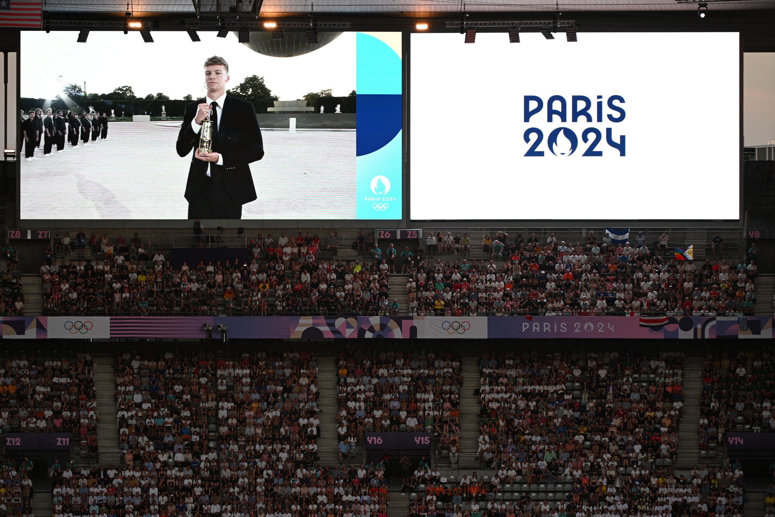 Léon Marchand, héroe indicutible para Francia en estos juegos, siendo el deportista más galardonado en París con 5 medallas, ha sido el encargado en trasladar el fuego olímpico desde el pebetero hasta el Parque de los Príncipes.