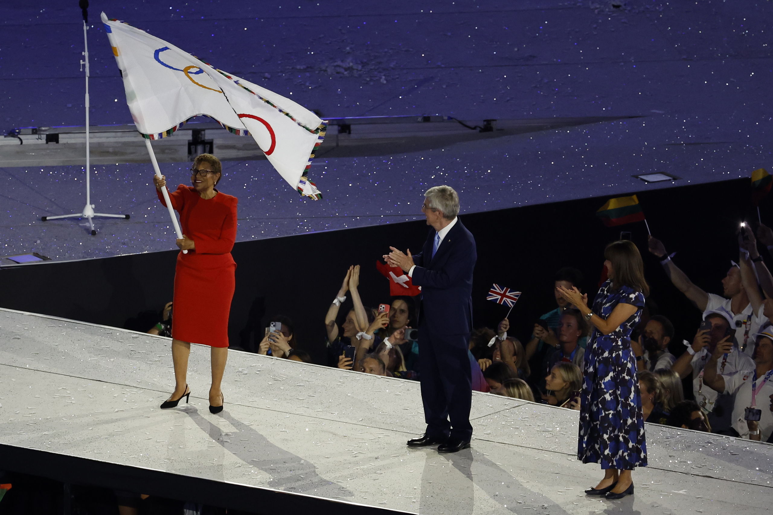 La alcaldesa de París, Anne Hidalgo, entrega el testigo de la bandera olímpica a la alcaldesa de Los Ángeles, Karen Bass.