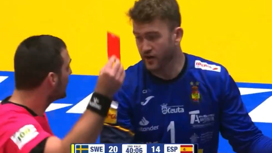 El guardameta paró con el antebrazo y el rechace le dio en la cara, el colegiado interpretó que el jugador del Barça y compañero de Pérez de Vargas en el club blaugrana había tirado a la cara del guardameta español. Ante esta situación, el árbitro le mostró la cartulina roja al lanzador Hampus Wanne.