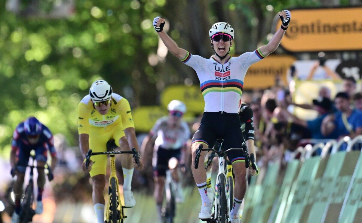 Pogacar ya es centenario y lo ha logrado nada más y nada menos que en el Tour de Francia y vestido con el maillot arcoiris de campeón del mundo. Además, con una victoria marca de la casa, atacando en el último muro de una etapa con un final vibrante e imponiéndose a otros dos colosos como son van der Poel y Vingegaard, que parece ser el único que, si no cambian las cosas, puede disputarle el Tour al esloveno.