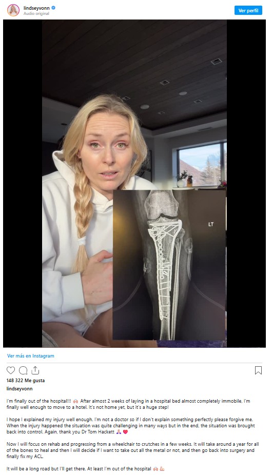 Vonn, entre lágrimas, explica cómo será su largo proceso de recuperación: "Tardaré aproximadamente un año para que todos los huesos sanen y luego decidiré si quiero sacar todo el metal de mi cuerpo o no, y luego volver a la cirugía y finalmente arreglar mi ligamento cruzado anterior. La vida es así, hay que aguantar los golpes como vienen".