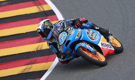 El español Alex Rins (KTM) ha logrado su segunda victoria de la temporada al imponerse en un apretado final en el Gran Premio de Alemania de Moto3 disputado en Sachsenring. Rins sorprendió al líder de mundial y compatriota Luis Salom (KTM) a dos curvas del final en la pelea por la victoria, mientras que Maverick Viñales (KTM) acabó tercero.