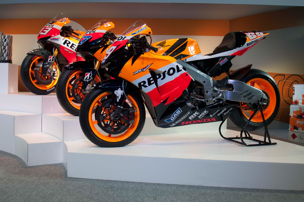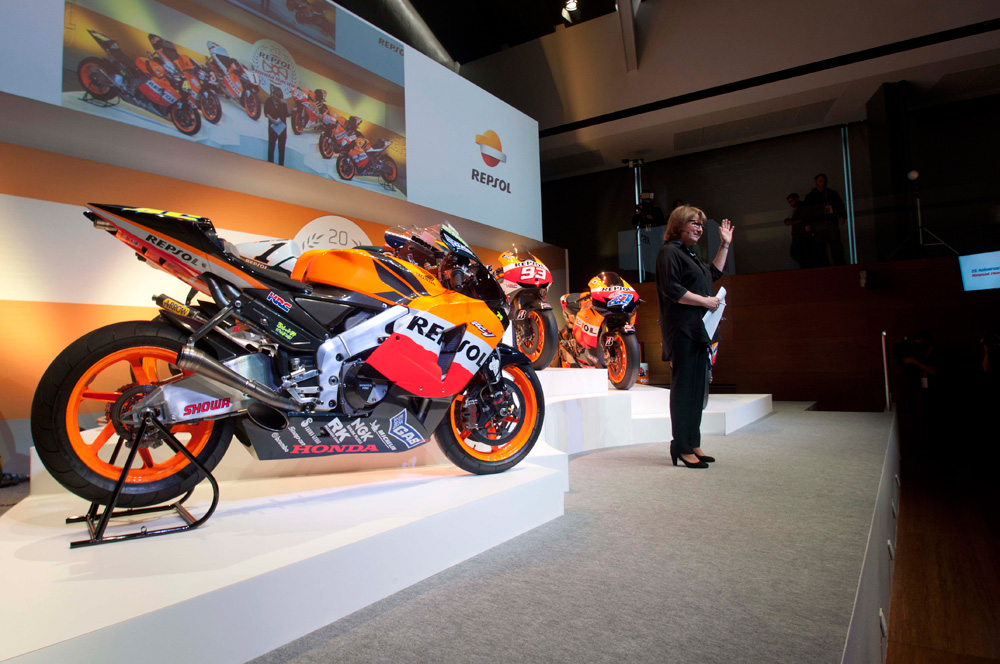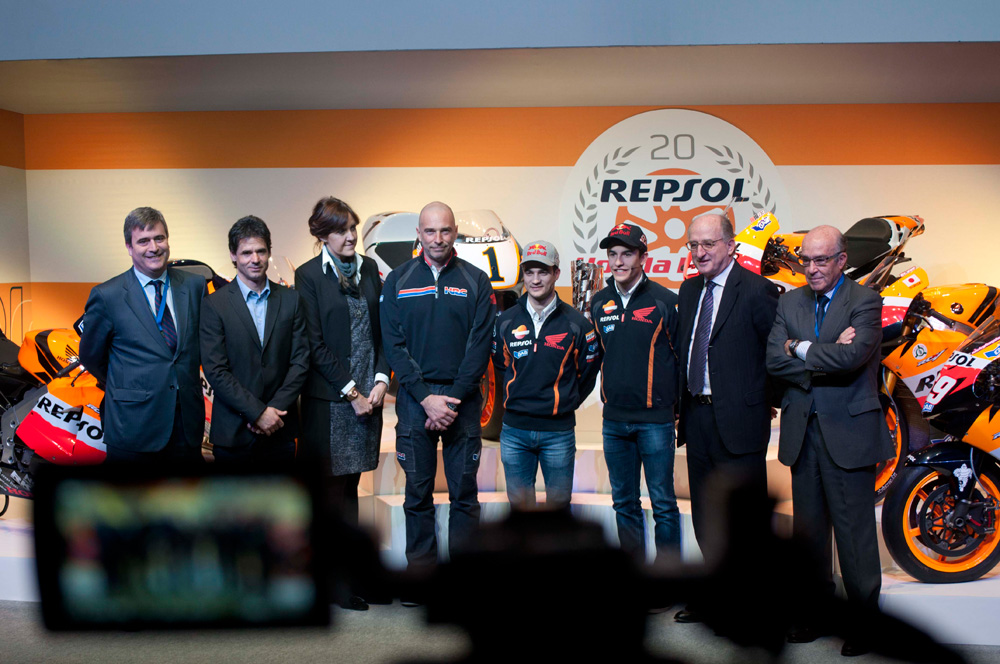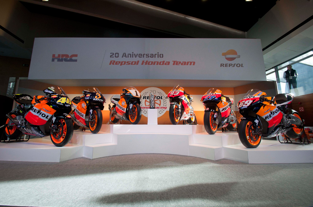 El campus Repsol en Madrid ha sido el escenario de lujo para la presentación del equipo Repsol Honda para el Mundial de MotoGP 2014 y el acto en el que se han conmemorado los 20 años de esta exitosa alianza. Un escenario que ha estado presidido por seis motos campeonas del mundo, que en su día utilizaron Mick Doohan, Alex Crivillé, Valentino Rossi, Casey Stoner, Nicky Hayden y Marc Márquez.