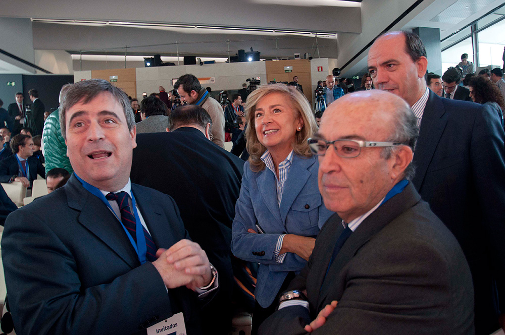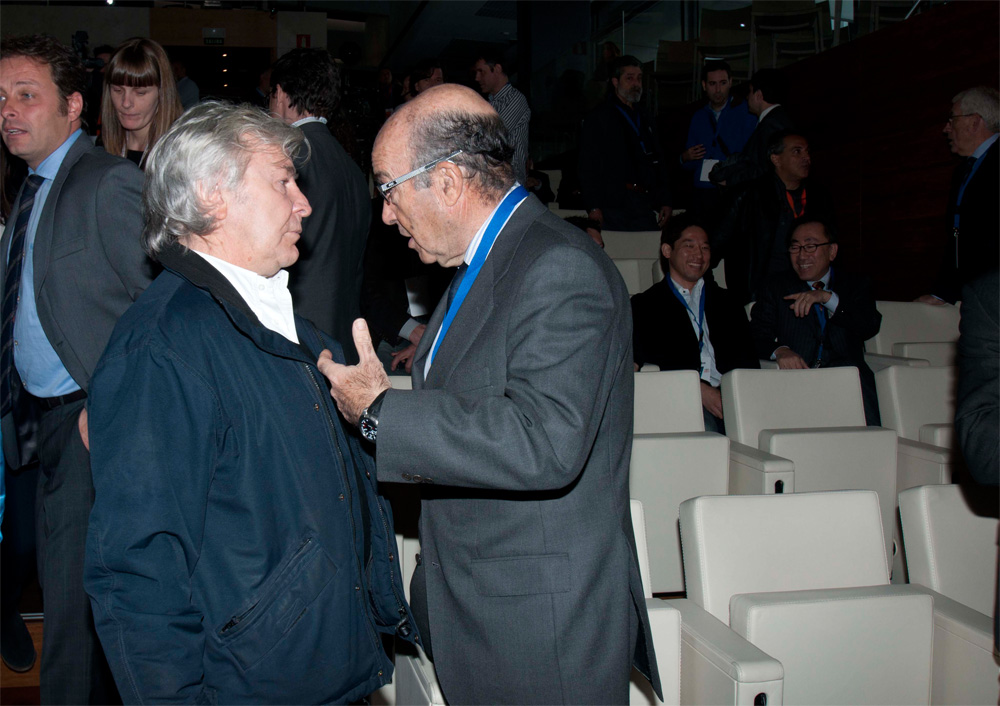 El presidente del Consejo Superior de Deportes (CSD) y secretario de Estado para el Deporte, Miguel Cardenal (i), charla con el presidente ejecutivo de Dorna, Carmelo Ezpeleta (2d), antes de que diera comienzo el acto.