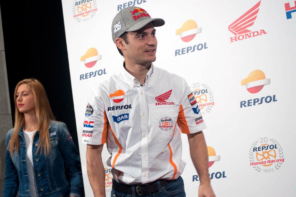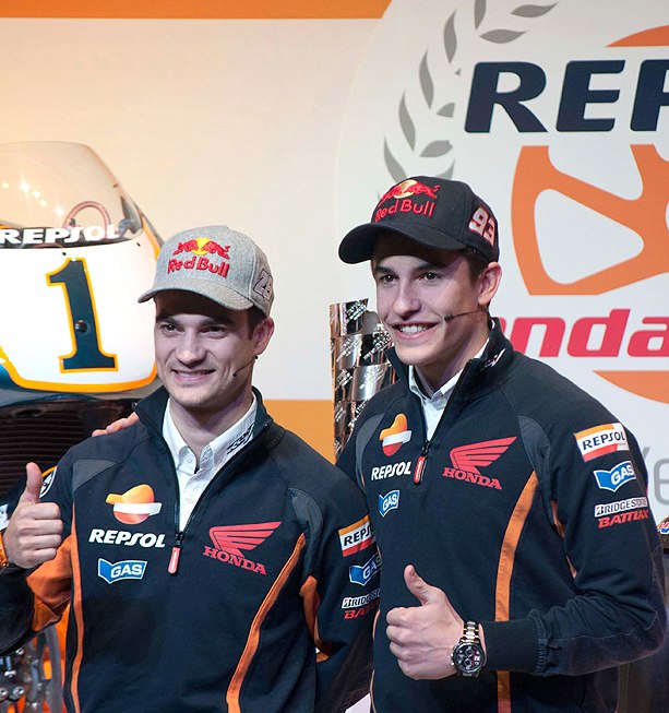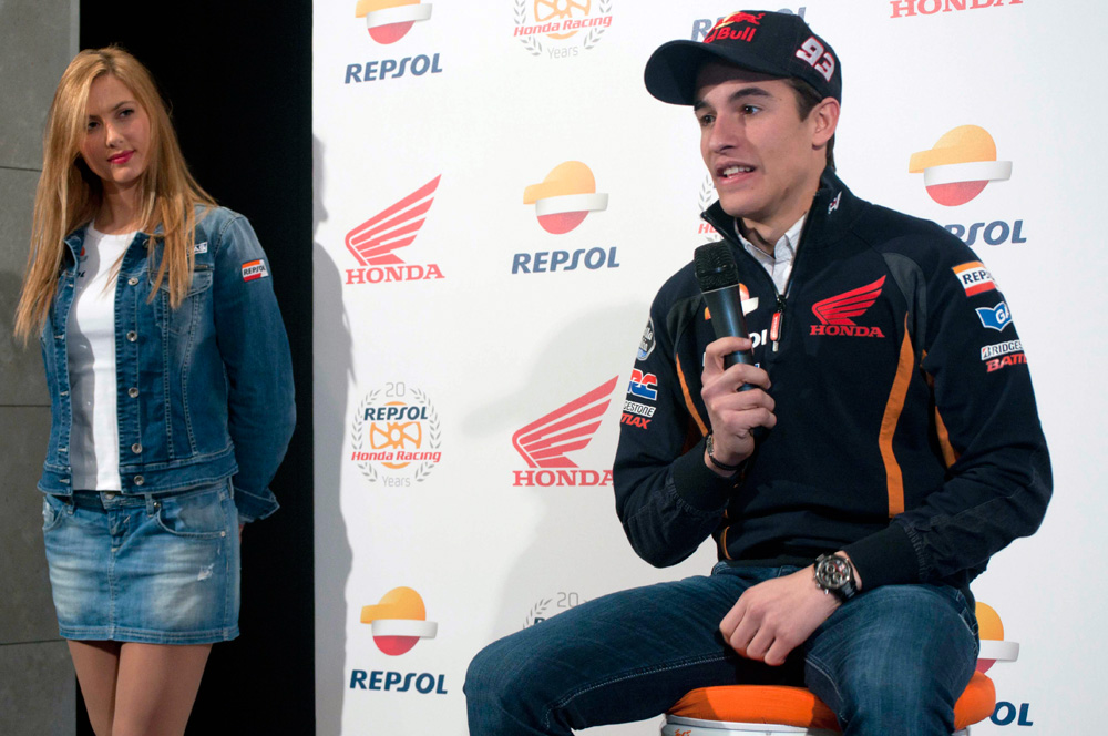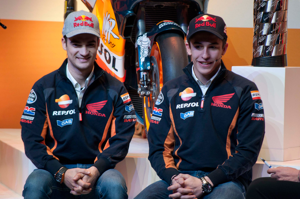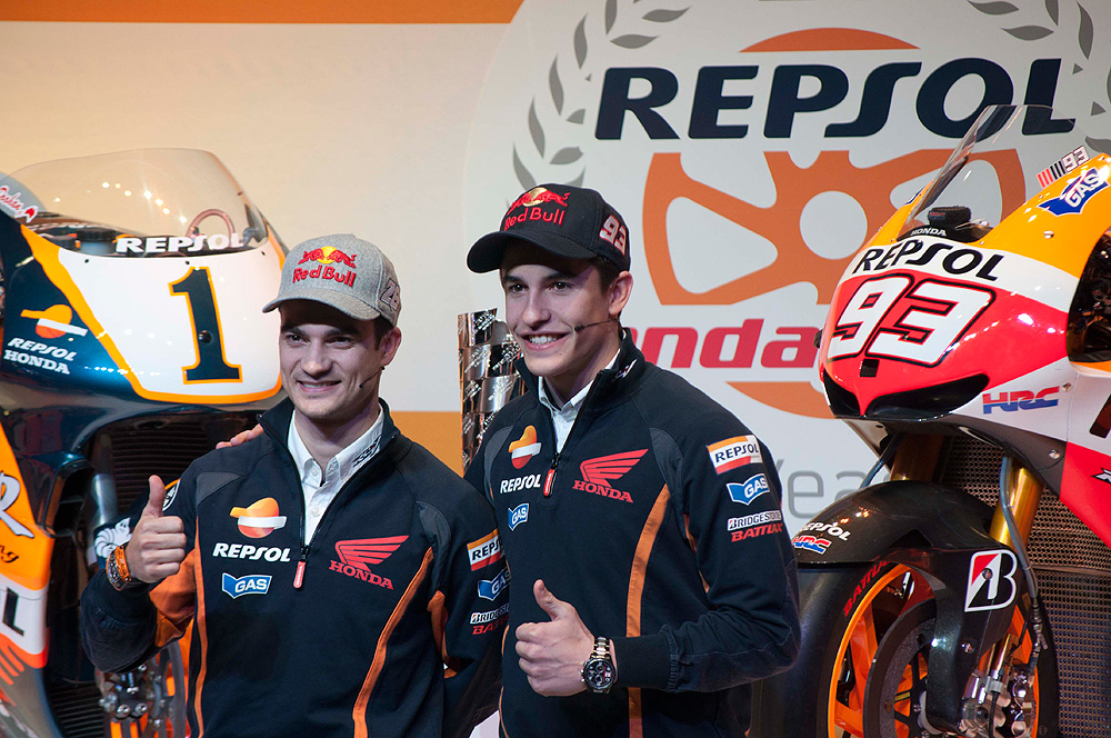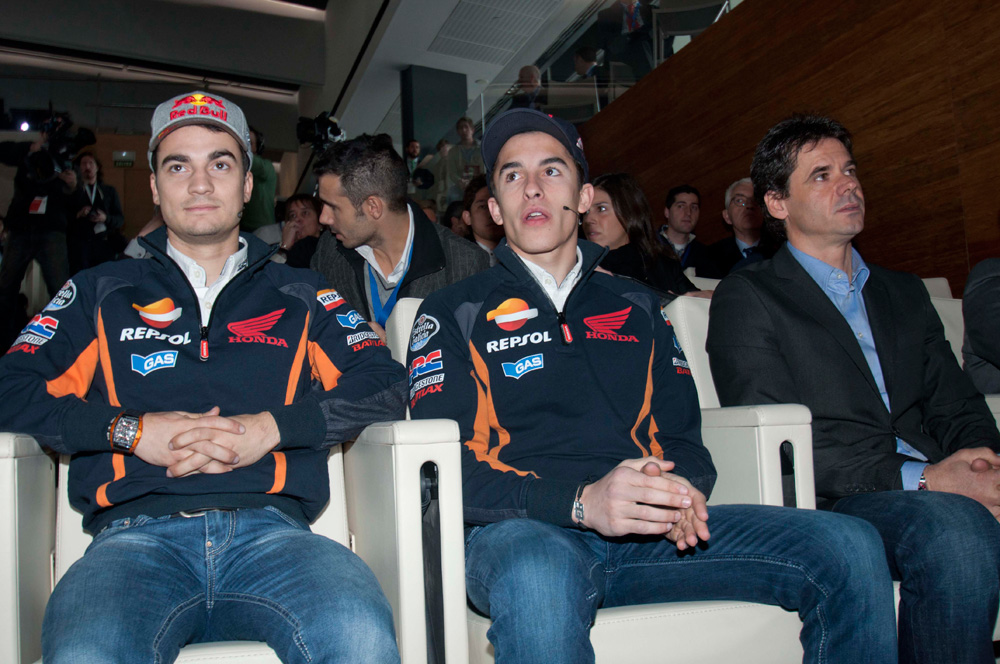 Tras el evento en sí, Marc Márquez y Dani Pedrosa hablaron en rueda de prensa para los medios de comunicación congregados en el campus Repsol, escoltados por dos bellas y sonrientes azafatas.