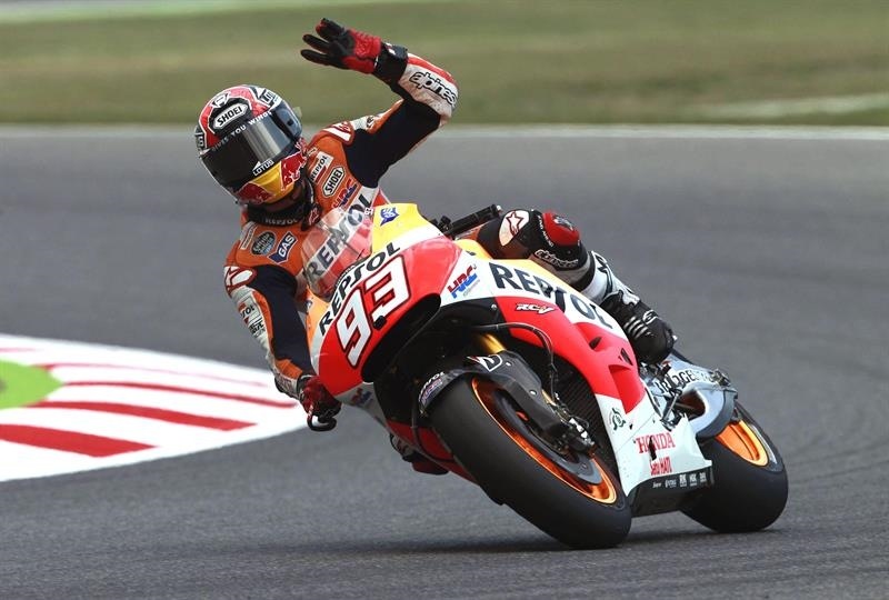 Márquez estuvo bastante acertado en la salida, pero en la apurada de frenada de final de recta se le metió por el interior Jorge Lorenzo y ambos casi llegaron a tocar, obligando al doble campeón del mundo de Repsol Honda a abrirse en exceso y con ello perder posiciones hasta colocarse octavo tras el británico Bradley Smith (Yamaha YZR M 1).