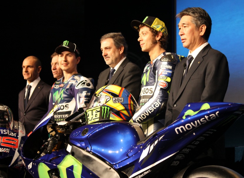 Además de los pilotos Jorge Lorenzo y Valentino Rossi, el acto también contó con la presencia de Luis Miguel Gilpérez (c), presidente de Telefónica España; Kouichi Tsuji (d), mánager general de Yamaha Motor Corporation, y Lin Jarvis (2i), director de Yamaha Motor Racing.