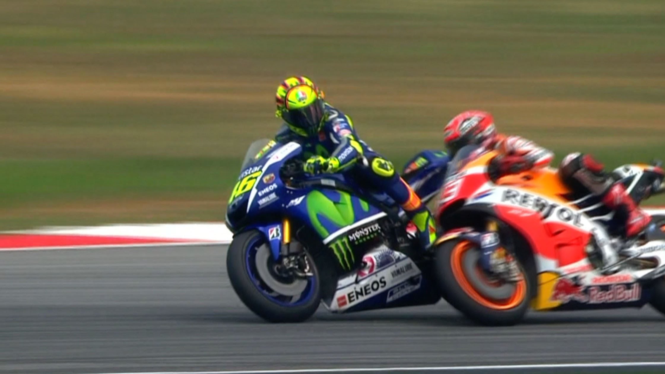 Patada de Valentino Rossi a Márquez en Malasia desde el aire