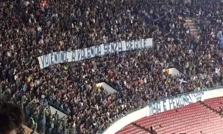 Este miércoles, durante el partido de la décima jornada de la Serie A frente al Palermo, en un lugar de la grada de San Paolo que ocupan los ultras napolitanos se podían leer dos salvajes pancartas apoyando a Rossi de cara a la última carrera de la temporada, el próximo 8 de noviembre en el Circuito de Cheste -allí se juega Il Dottore el título con su compañero Jorge Lorenzo- y de paso incitando a la violencia.