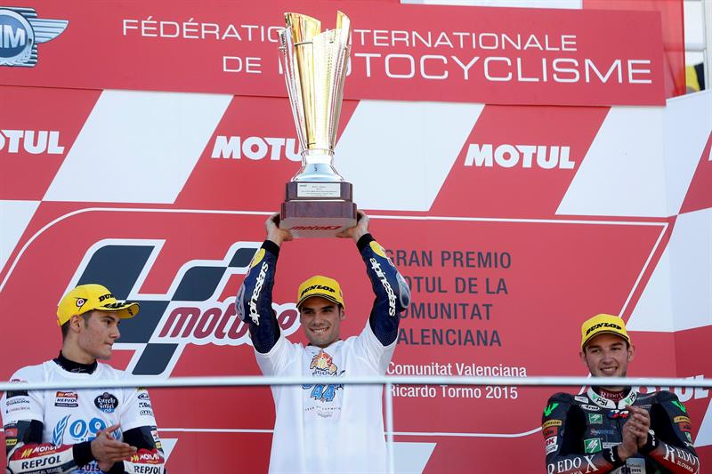 El portugués Miguel Oliveira (KTM) y el británico Danny Kent (Honda) hicieron a la perfección sus deberes y el primero se adjudicó la victoria en el Gran Premio de la Comunidad Valenciana de Moto3 en el circuito Ricardo Tormo de Cheste, en tanto que el segundo se proclamó campeón del mundo.