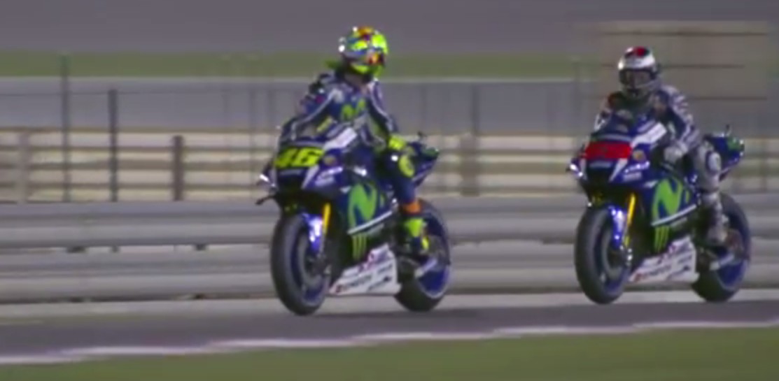 Primer Gran Premio de la temporada y primer pique entre Valentino Rossi y Jorge Lorenzo. El italiano, que termina de renovar con la compañía japonesa, recriminó al piloto español que le obstruyó en su vuelta porque iba por la trazada buena cuando rodaba muy lento (Jorge acababa de salir de boxes). Rossi agitó la cabeza de lado a lado, aminoró la marcha y se giró al balear. Lorenzo levantó la cabeza y, en ese momento, Valentino le levantó el brazo en señal de queja.