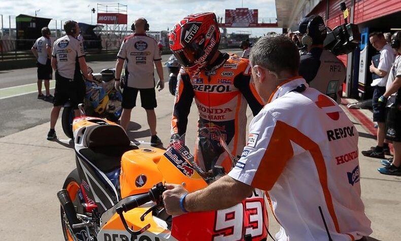 El español Marc Márquez (Repsol Honda RC 213 V) se puso al frente de la clasificación tras la primera jornada de entrenamientos del Gran Premio de Argentina de MotoGP, que se completó este viernes en el circuito de Termas de Río Hondo, pero todavía está lejos de los mejores tiempos establecidos en 2014.