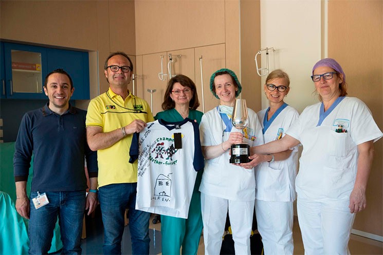 Pratesi también repartió entre los niños enfermos camisetas y gorras firmadas por el piloto de Yamaha. El personal de pediatría del hospital devolvió el gesto a Rossi entregándole al presidente de su club de fans una camiseta con dibujos hechos por varios pequeños ingresados en la planta de oncología.