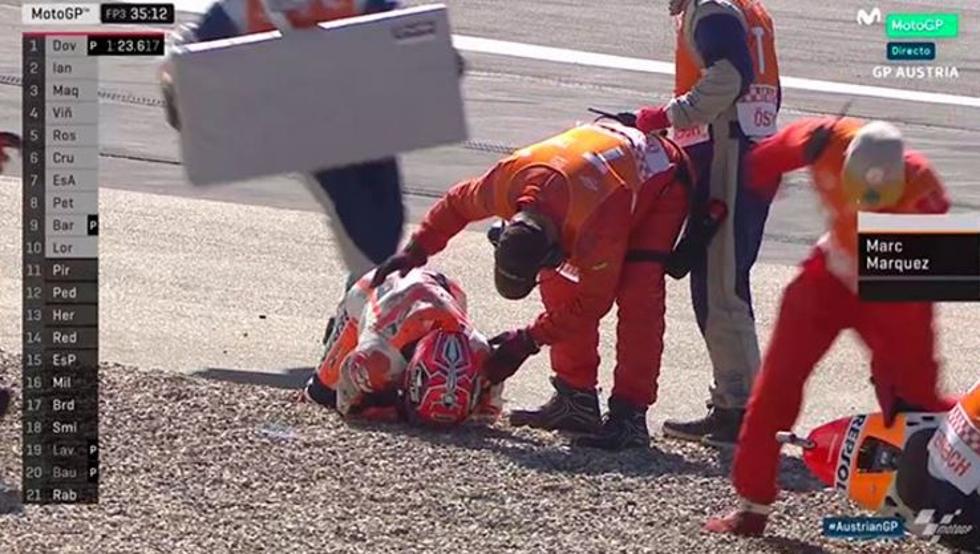 El español Marc Márquez (Repsol Honda RC 213 V) se encuentra bien tras la brutal caída sufrida en los entrenamientos libres en el circuito Red Bulls de Sapielberg.
