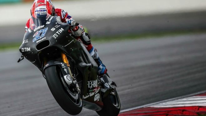 Casey Stoner sorprendió a todos logrando el mejor tiempo en la primera jornada de test en Sepang. El australiano había rodado dos días con la GP17 con el resto de probadores la pasada semana y Ducati optó por alinearle también con los oficiales. Y el oceánico marcó un gran registro, por debajo de la barrera de los 2 minutos (1:59.681).