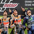 El trío campeón haciendo un gesto para conmemorar a Ángel Nieto. | EFE Triplete español en la República Checa En un día especial donde se rendía homenaje a Ángel Nieto, Marc Márquez logró la victoria y aumenta su ventaja en la clasificación general.