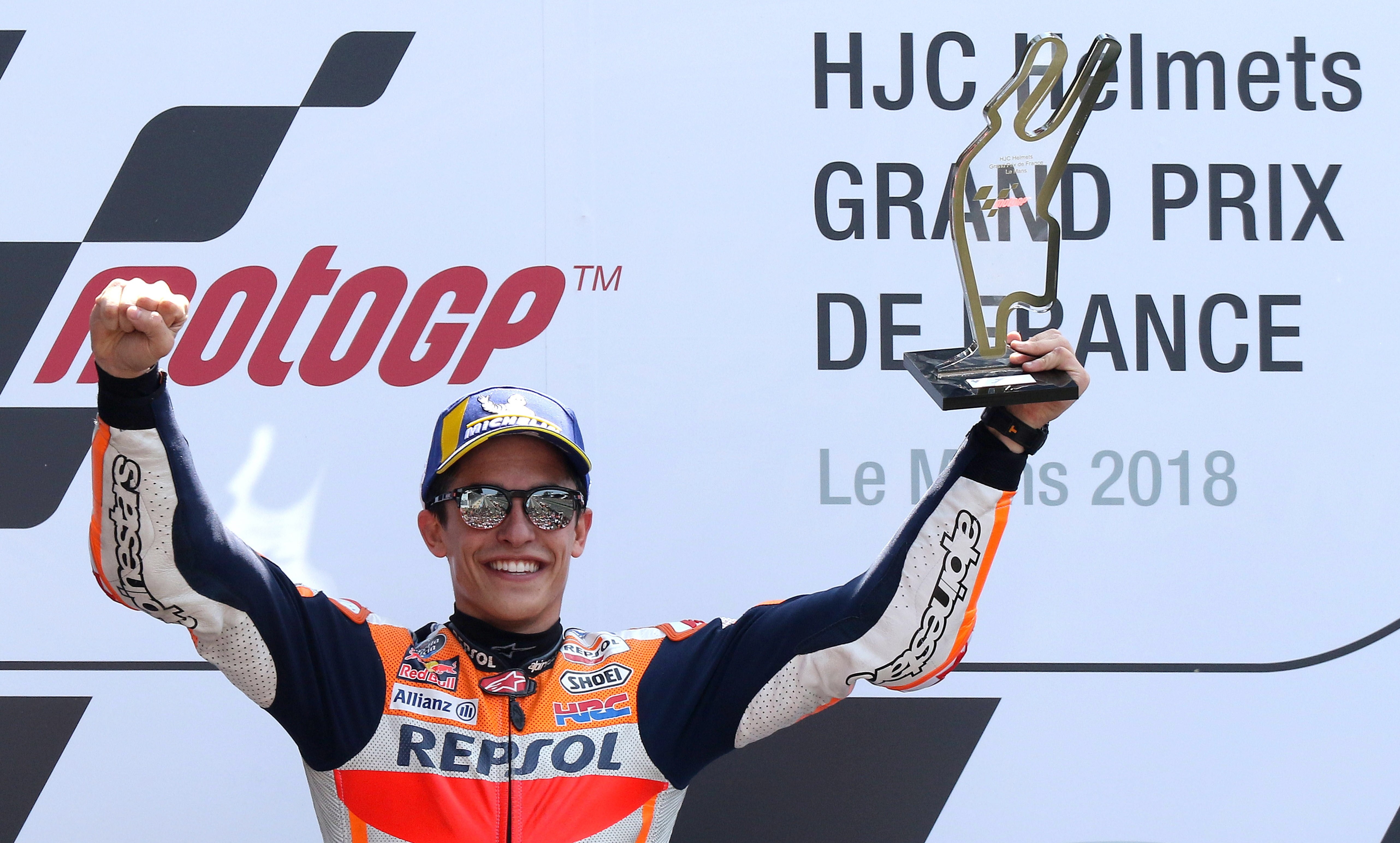 El español Marc Márquez (Repsol Honda RC 213 V)logró su tercera victoria consecutiva de la temporada al imponerse de manera contundente en el Gran Premio de Francia de MotoGP que se disputó este domingo, en el circuito de Le Mans, por delante de los italianos Danilo Petrucci (Ducati Desmosedici GP18) y Valentino Rossi (Yamaha YZR M 1).